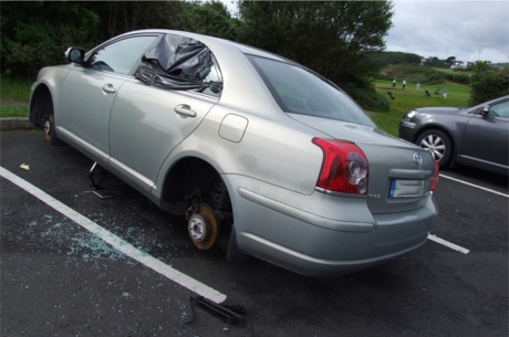 The car belonging to a bar man at Greencastle Golf Club which was stripped of its expensive alloy wheels by brazen thieves last weekend.