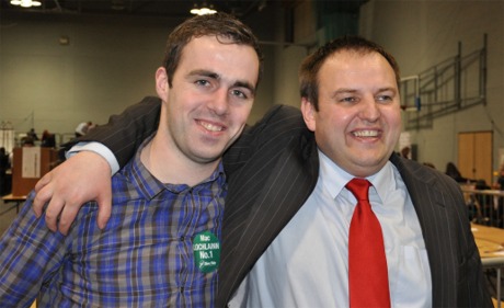 Jack Murray, left, with Deputy Pádraig MacLochainn at the Donegal North East election count in Letterkenny.