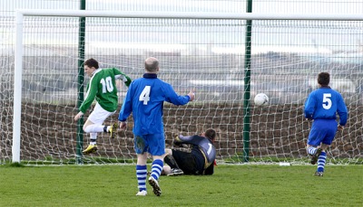 into the net from fifty yards. Settling to their task after a shaky opening, Moville had the better of the next fifteen minutes with Conor Lafferty orchestrating a number of threatening attacks. Winger Shaun Doherty dragged wide under pressure from eight yards following Lafferty’s scuffed shot before the Moville number 11 fired inches over from a free-kick. |