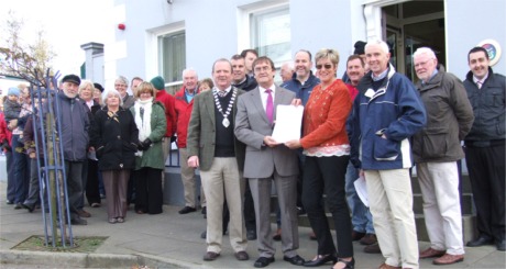 Members of the East Inishowen Business Association and local community hand over a petition protesting at AIB's plan to close its Moville branch next year.