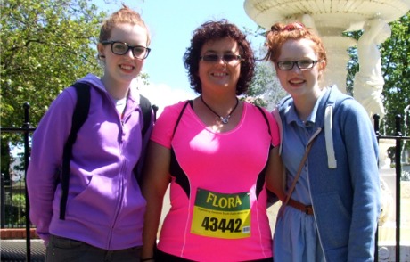 Newtown practice nurse, Lorraine Porter, who will walk 60 miles for breast cancer research in October of this year, pictured with her daughters Katie and Niamh before the recent Flora mini marathon.