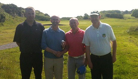 Gerry Guckian holds up his lucky ball after his second hole-in-one. Pictured from left, Hugh Casey, Gerry Guckian, Tommy McBride and Neil Guckian.