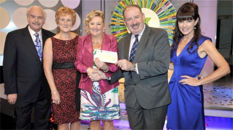 Pictured at the presentation of winning cheques were from left: Marty Whelan game show host. Susan Doherty The National Lottery ticket selling agent from G+S Supermarket Carndonagh, Co Donegal. Sandra Mullarkey winning participant. Peter Plunkett, Head of IT, The National Lottery, and Geri Maye game show host. Pic Mac Innes Photography.