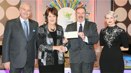 CARNDONAGH'S Agnes McLaughlin who won €45,000 including a car on Winning Streak on Saturday April 12. Pictured from left are gameshow host Marty Whelan, Agnes McLaughlin, Peter Plunkett of the National Lottery and gameshow host Sinead Kennedy. The winning ticket was bought at Canny and Doherty’s supermarket.