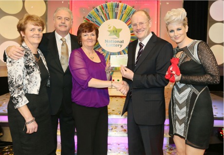 Mary managed to scoop €32,000 for Joseph including a holiday to Kenya. Pictured at the presentation of winning cheques were from left: Bernie Kearney, selling agent, Kelly’s, Mill Brae, Carndonagh; Marty Whelan, gameshow co-host; Mary McDermott the winning player; Harry Cooke, head of operations, National Lottery and Sinead Kennedy, gameshow co-host.