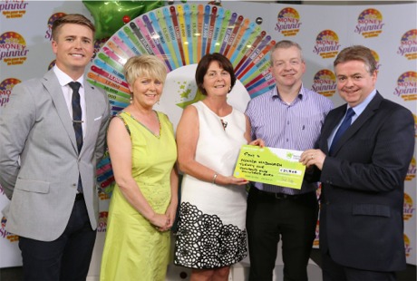 BUNCRANA woman Monica McDonagh who won €21,500 on the National Lottery’s Money Spinner game on Saturday. Letterkenny-based Monica is pictured receiving her cheque following the gameshow with host Brian Ormond, Pauline and Eunan McLaughlin of Mac’s, Buncrana and Brendan McGrenra of the National Lottery.