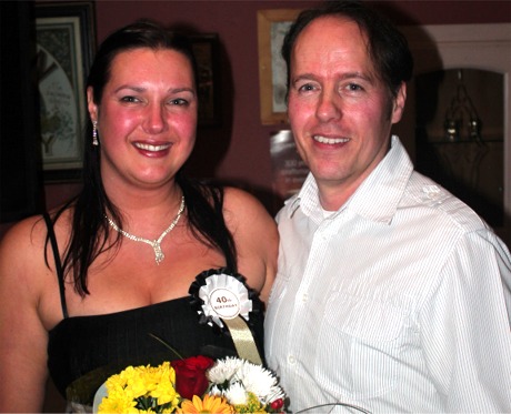 Pictured are Mandi McKenna with husband Paul who arranged her surprise bash in Callaghan's Pub, Quigley's Point.