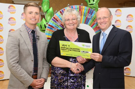 She is pictured at the presentation of winning cheques with gameshow host Brian Ormond and National Lottery head of operations, Harry Cooke.