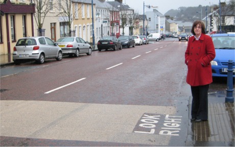 Fianna Fáil local election candidate for the Foyle area, Mary McCauley, pictured at one of the 'confusing' crossing points in Moville town centre.