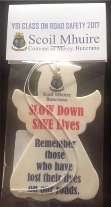 Transition Year students at Scoil Mhuire, Buncrana, Co Donegal, have launched a unique angel-shaped air freshener printed with the words: 'SLOW Down, SAVE Lives: Remember those who have lost their lives on our roads'.