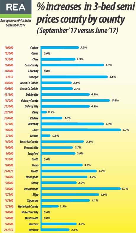 The REA Average House Price Survey concentrates on the actual sale price of Ireland's typical stock home, the three-bed semi, giving an up-to-date picture of the property market in towns and cities countrywide to the close of last week.