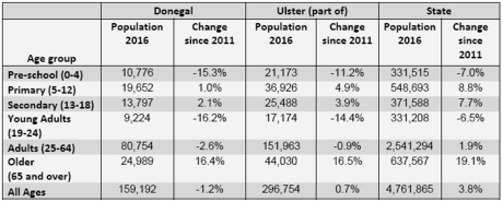 The figures show that in Donegal, the numbers in the pre-school, young adults and adults age groups all fell between 2011 and 2016, while nationally only the pre-school and young adults age groups showed a decline. The numbers in the pre-school age group fell by 15.3%, compared to a national decline of 7.0%, while the numbers of young adults fell by 16.2% in Donegal as against a fall of 6.5% nationally.