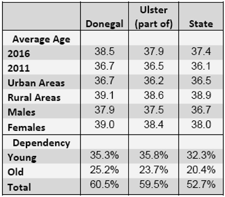 THE average age of the Donegal population is currently 38.5 years, almost two years older than in 2011 and a year older than the national average, Census data shows.