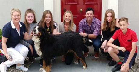 Riversdale Country House owner, Sharon Moore, with guests Rory and Erica McIlroy and four of her five children, from left, Holly, Bethany, Aimee and Jack. Soaking up all the attention is the Moores’ Bernese mountain dog Jessie.