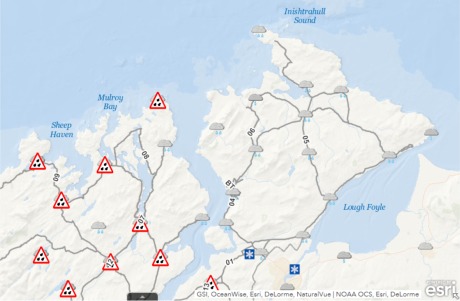 Live road conditions at a number of locations around the county and the northwest can also be viewed via the Councils website. Locations include N56 Gaoth Dobhair, N15 Bundoran, N15 Lough Mourne, N15 Killygordon, N13 An Grianan Aileach, N56 Ardara, A37 Coleraine Mountain, A515 Foyle Bridge and A6 Glenshane Pass.