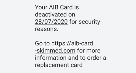 Gardaí wish to alert the public to a ‘smishing’ scam whereby persons are being contacted by a text message, from individuals purporting to be from Allied Irish Bank (AIB), telling them their bank card has been compromised.