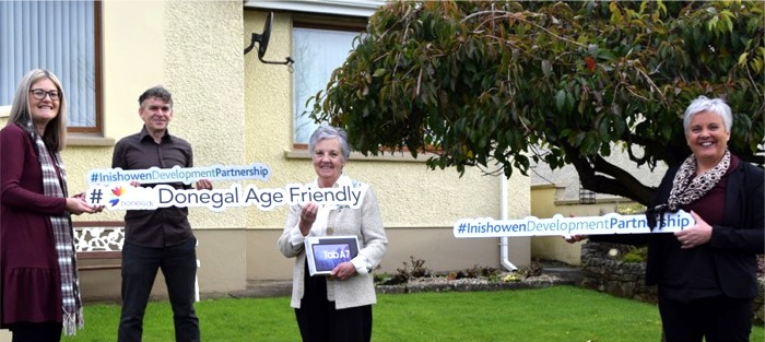 Left to right: Mairead Cranley, Donegal Age Friendly Programme; Denis Kelly, Inishowen Development Partnership; Anna McCallion, winner and Shauna McClenaghen, Inishowen Development Partnership.