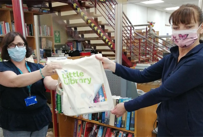 Kim from the Central Library (left) handing over a Little Library bag to Rosie Piper from House of Fun montessori preschool.