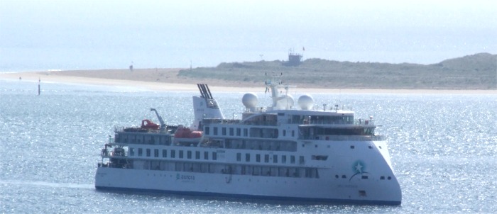 The expedition ship, Greg Mortimer, anchored off Greencastle.