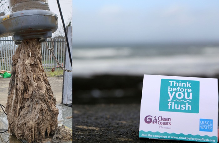 Think Before You Flush: Image on the left shows an 8ft blockage at a pump station.