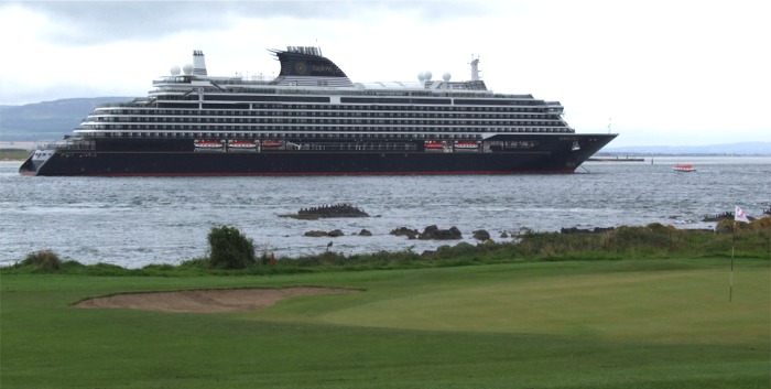 The MSC Explora I anchored off Greencastle Golf Club. A tender boat returns from dropping passengers off at Greencastle Harbour.