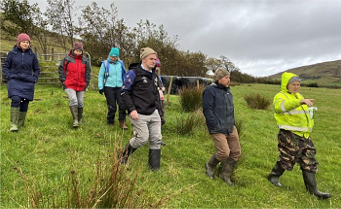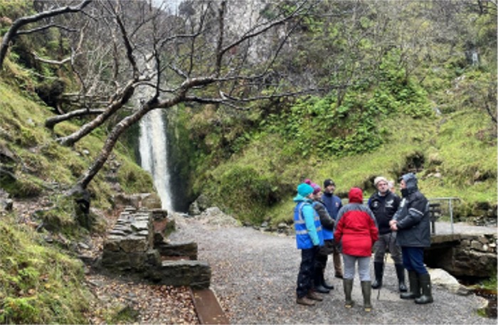 The final stop in the tour was a visit to the picturesque Glenevin Waterfall to recall the destruction caused by the 2017 flood there and the subsequent rebuilding of the famous walkway through a big community effort involving landowners, local people and contractors. It was discussed how the potential for NFM measures upstream could delay the release of floodwaters over the waterfall without interfering with the waterfalls overall natural beauty and flow.