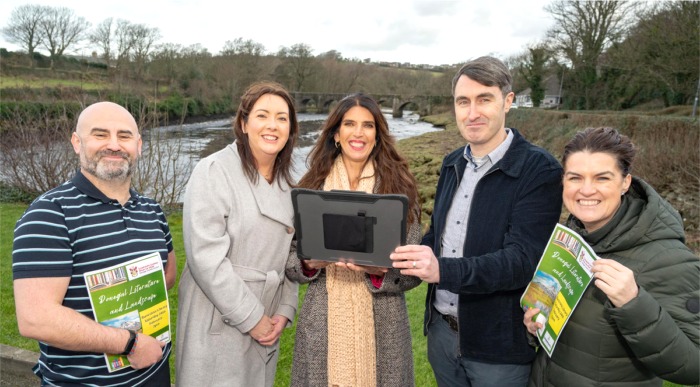 Launching the Donegal Literature and Landscape event from left are Morgan Fry, Librarian Assistant, Donna Cavanagh, Senior Executive Librarian, Donegal Library Service, Kathy Donaghy, Author, Freelance Journalist and Event Moderator, Joe Kelly, Executive Librarian and Sinead McLaughlin, Executive Librarian. Photo Clive Wasson.