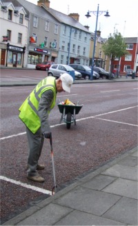 The seaside town of Moville has no full-time street cleaning service, however, two council workers empty the public bins twice a week. They have a good rapport with the unofficial street cleaner and kit him out with heavy-duty bin bags, litter pickers, gloves and a place to bring the rubbish. He is much appreciated too by local shop-keepers and sometimes gets his breakfast free at a local diner.