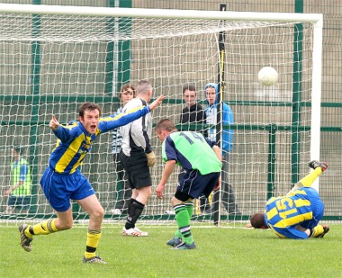 side netting. With 89 minutes gone the sides were still deadlocked and the Illies took a shock lead. Substitute John Donaghy whipped a cross into Gavin Doherty who gave his side the lead with a glancing header just past Kieran Gallagher. Illies looked safe, but the day’s drama was just beginning. McDermott did fantastically well to tip over a Conor Gallagher effort as Aileach piled forward in search of an equalizer. With two minutes of stoppage time played Dermot McGlynn forced the game into extra time getting the last touch on a long ball into the box. The looks of disbelief on the Illies players’ faces told a story. |