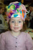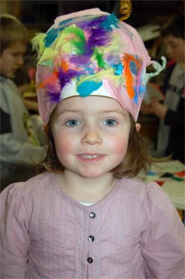 This budding hat maker enjoys the Artlink workshop on World Community Arts Day in Tullyarvan Mill.