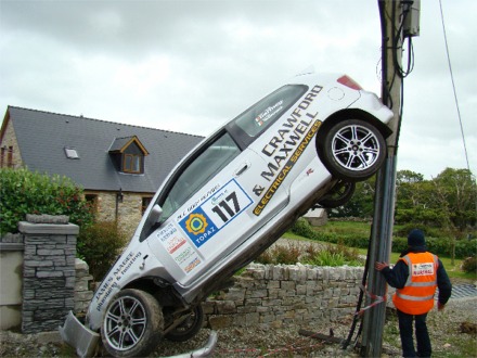 “There’s a little hump on the road that sent all the cars into the air and made for a really spectacular start to the stage,” said Mr O’Connor. “McDermott’s car flew into the air and hit a bank with a stile in it. The car rolled, hit my pillar and ended in an upright position.