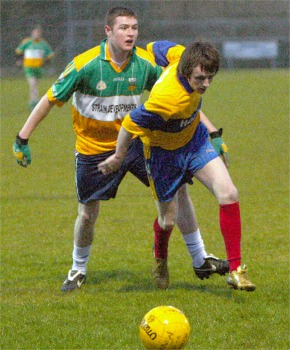 Squally rain showers and strong winds made for very difficult playing conditions and both teams took some time to settle down. Referee Sean McLaughlin laid down the law early on issuing a couple of yellow cards and ten minutes had elapsed before Seanan Murphy opened the scoring with a point after taking a pass from Paddy McMyler.
