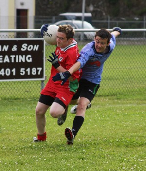 minimum between the sides once again. Moville’s Donegal minor Enda Faulkner then saw his shot from a tight angle beaten around the post by Brendan McGonagle. The same Moville player showed his worth at the other end knocking the ball out of Rory Ward’s hand with the Carn player bearing down on goal. Carn’s backs had no answer to McDermott’s powerful running and had to watch as time and again he cut to the left and struck over. Still, Moville’s defence had enough on their plate. They struggled to cope with Carn’s early high ball into the forward lines and when the screening Padraig Doherty intercepted the ball 50 metres out and hit a leading pass for Ronan Doherty, the Moville defender had little option but to bring the Carn forward down for a penalty. Doherty took a point to make it 1-7 to 0-7 with five minutes to go. Sean McQuillan made a telling block to stop Moville falling further behind and the Carrick Field lads closed the gap to 1-7 to 0-9 at the break, Faulkner teeing up McDermott for a couple. |