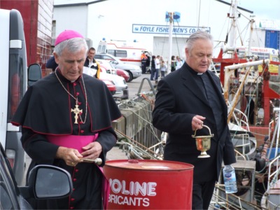 Dr Francis Lagan, Auxiliary Bishop of Derry and Moville Parish Priest Fr Paddy O'Kane perform the blessing of the vessels. Monica Warnock, husband Martin Robinson and their son, Seamus, 3, and daughter Maeve, 1. Some skippers take to their boats for the blessing. Foyle ferry passengers look on as the blessing ceremony gets underway. Four year old Ciara Barr, Redcastle, on board the Marliona for the blessing.