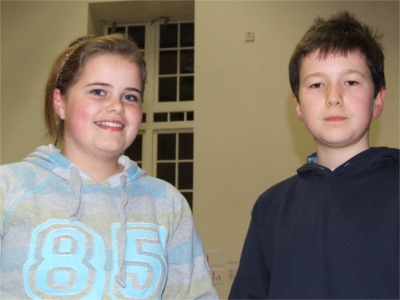 Last year's poster winner Tiarnan O Caolain congratulates Scoil Eoghain Upper runner up Laura Ryan.