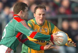 minutes after the restart. Wing-back Higgins, a thorn in Donegal’s side all afternoon, had put Mayo’s lead out to five, before Bradley finished off a move involving Christy Toye and David Walsh, with the latter unselfishly squaring across goal to Bradley who gleefully bundled the ball home. Alan Dillon and Conor Mortimer added scores for Mayo before David Walsh and Kevin Rafferty did likewise for Donegal, but with just four minutes remaining Mayo were back in command thanks to James Gill and Tom Parsons. Colm McFadden was on target in between times for Donegal and the St Michael’s man reduced the deficit with his seventh point of the game, leaving the game well poised heading into the final chapter, where Eamon McGee wrote a memorable last verse after Mayo were reduced to 14 men – Chris Barrett dismissed for collecting his second booking. |