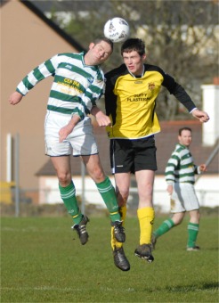On 56 minutes that second goal would have come but for a last ditch tackle from Patrick McDermott. Orr released Guinness on the left and his ball into the area seemed destined to land at the foot of a hooped shirt only for McDermott to slide in a couple of yards from his own goal an put the ball out for a corner that Graeme Doherty headed over the bar.
