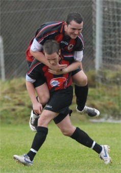 to try and make a breakthrough. Pike Rovers were made to rue their failure to make these chances pay when the home side took the lead after 72 minutes. A long punt from Crossan was nodded on by Feeney to Andy Porter whose finish sent the home crowd into raptures. The away side seemed stunned and started pressing the home defence but Redcastle were made of stern stuff with Martin Farren in particular defending heroically. For all their pressure the Limerick side couldn’t make a breakthrough and Redcastle put the tie beyond doubt with four minutes remaining. Another long punt from Crossan found Charlie McCormack who coolly placed his shot into the bottom corner to ensure a miserable six and a half hour journey home for the visitors. |