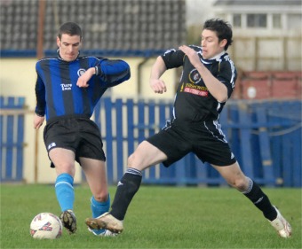18 yards. Dunree tried to respond but the sturdy defending of Barry McColgan and Dean Barron made chances scarce. McGuinness attempted a standing shot but he was unlucky to see it fall narrowly wide. QPS made good of neat and sharp passing on 27 minutes when Dunree keeper Johnny Noone failed to collect a long free from Barry McColgan and an unmarked Wallace took advantage with a tap in. Just after the half hour a third goal was recorded for the home side following a succession of corners. The heavily defended goalmouth scrambled the ball loose only for it to fall to the well-positioned Burke and his half volley found its way past a crowded box and crept over the line. |
