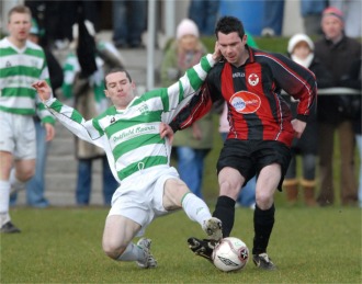 and Martin Farren completed the clearance. The team from the Waterford/Tipperary border town produced Reading and Ireland’s Stephen Hunt and in Kavanagh they had another all-action attacker who liked nothing better than to run with the ball right at the middle of the Redcastle defence. Somehow Redcastle made it to the break up by a goal, but there was to be no relief as Carrick penned them in to their own half in at the start of the second period. It was no surprise when the visitors equalised in the 62nd minute. Stephen Hassey was fouled just outside the Redcastle area. Kavanagh stepped up and curled a free kick, |