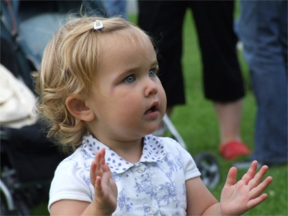 July 2007 - Malin Raft Race. Stratospheric's number one fan: Suzie Lafferty, 19mths, Malin claps and dances along to the music in the village green.