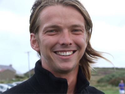 Aussie Tim Goodacre, who walked from Mizen Head to Malin Head for charity with toy donkey 'Asal' on his back, arrives in time for Malin Head Sports Day.